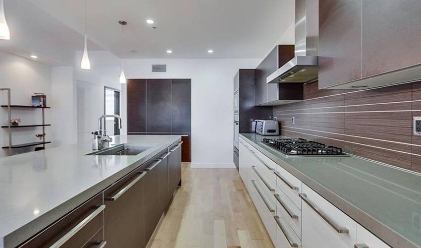 The expert designer says to opt for a wall length of no less than 12 feet to keep the sink and cooktop at sufficient distance from each other. In addition, place the units like fridge, oven housing, and pantry storage on the other side. The epitome of this arrangement helps in offering enormous storage space, keeping the kitchen organized, and making countertops free of clutter.
