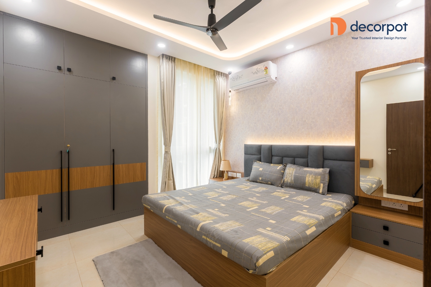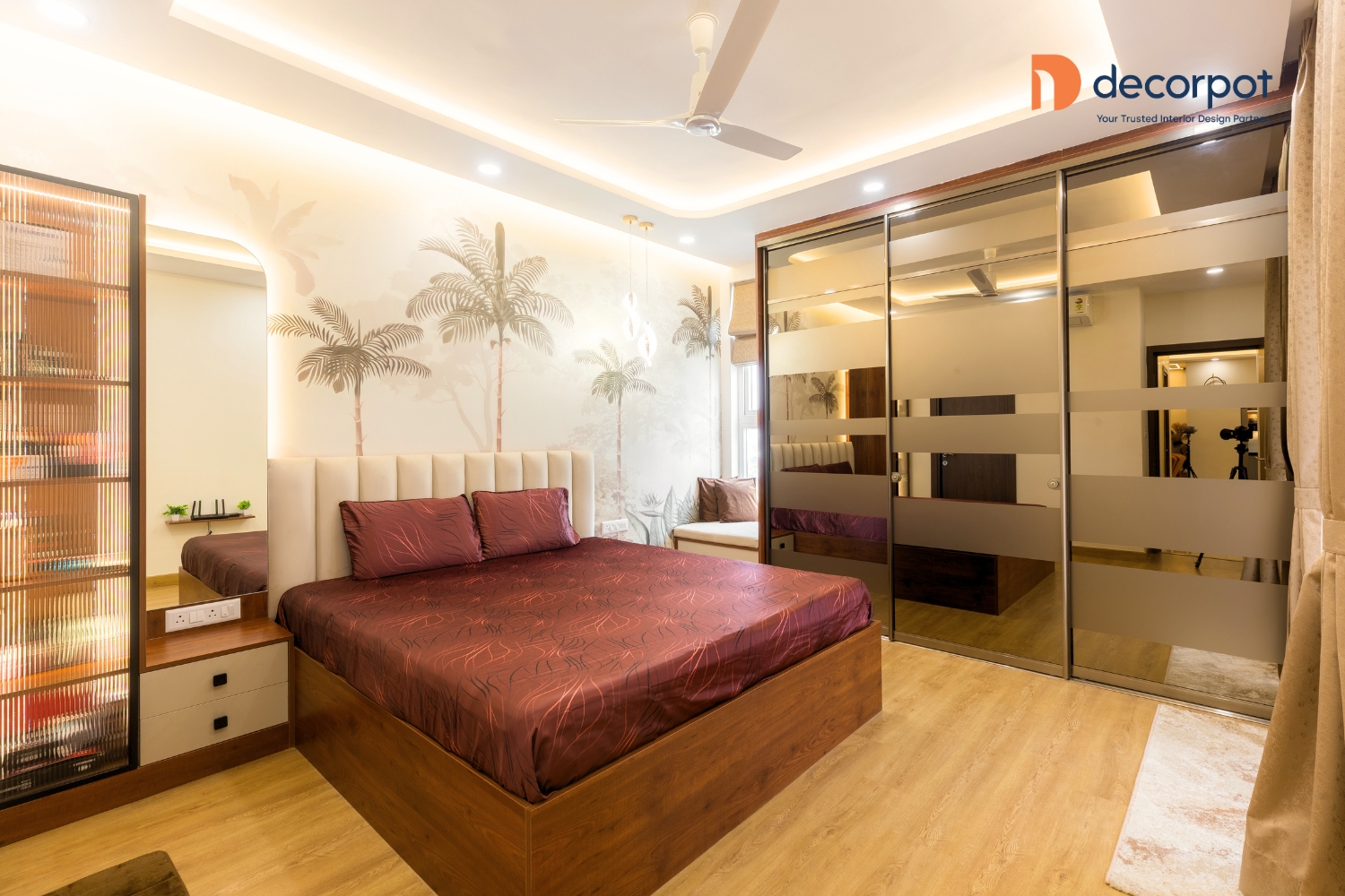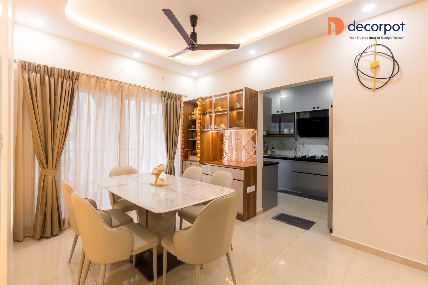 Interior designers in Bangalore at Decorpot brought this vision together through a seamless and well-guided process, where every design decision was shaped in close discussion with the homeowners. The result was a home with thoughtful details and well-balanced home interiors, from the crockery unit with a V-groove mirror backdrop and pooja space in the dining area to the modular kitchen with a granite countertop and storage options. In the bedroom, features like the wallpaper backdrop, tall storage unit with fluted glass near the dresser, and sliding wardrobe with lacquered glass shutter added both warmth and character. What stood out most for the homeowners was the honesty in pricing, the quality of finishes, and the way the entire home came together with clarity, comfort, and care.