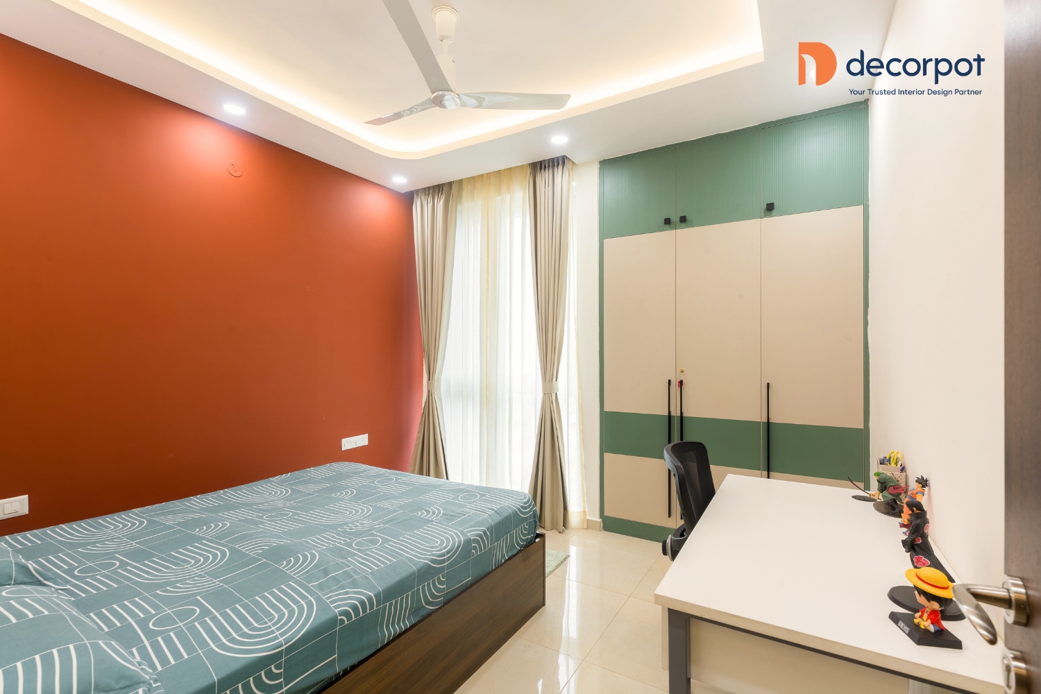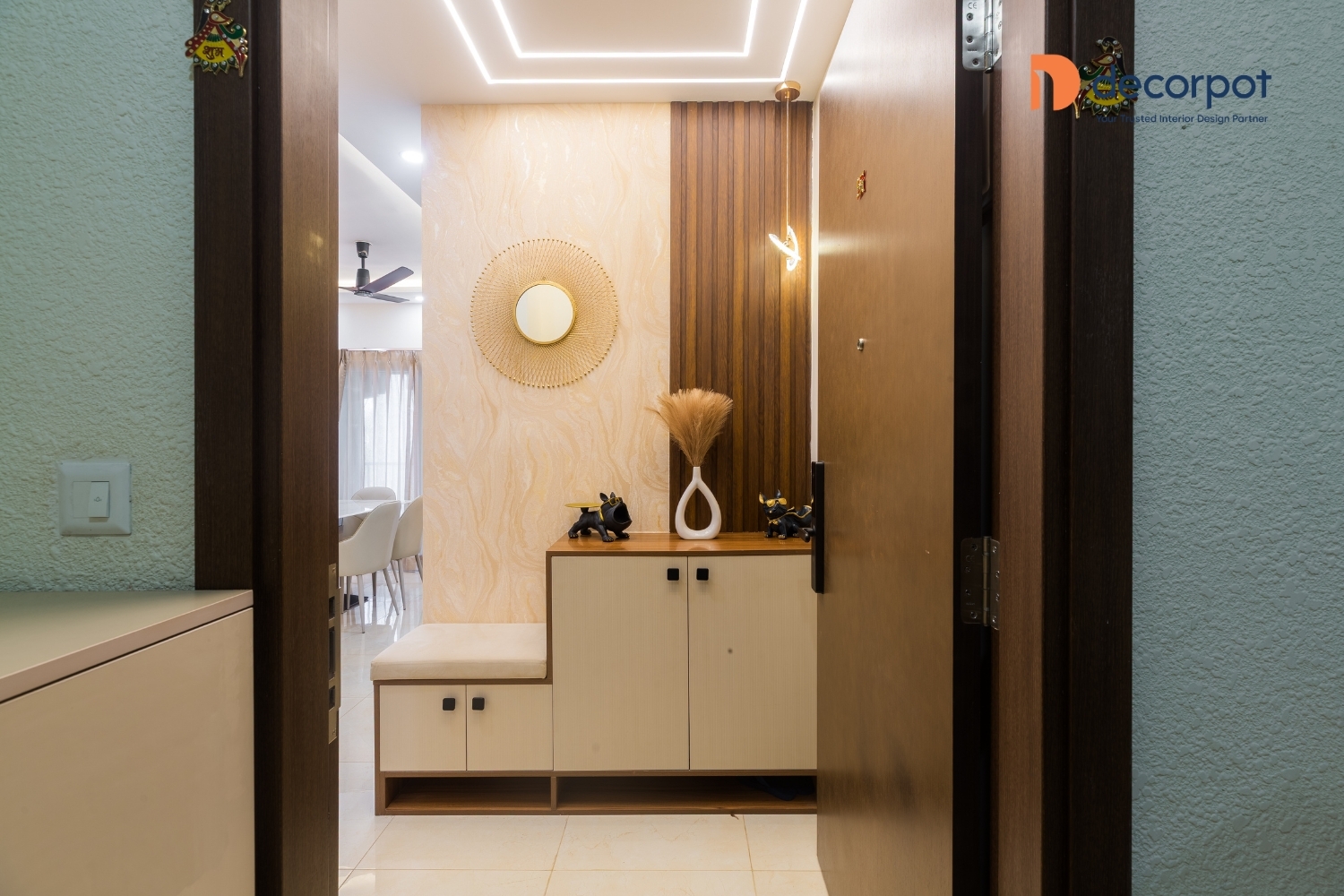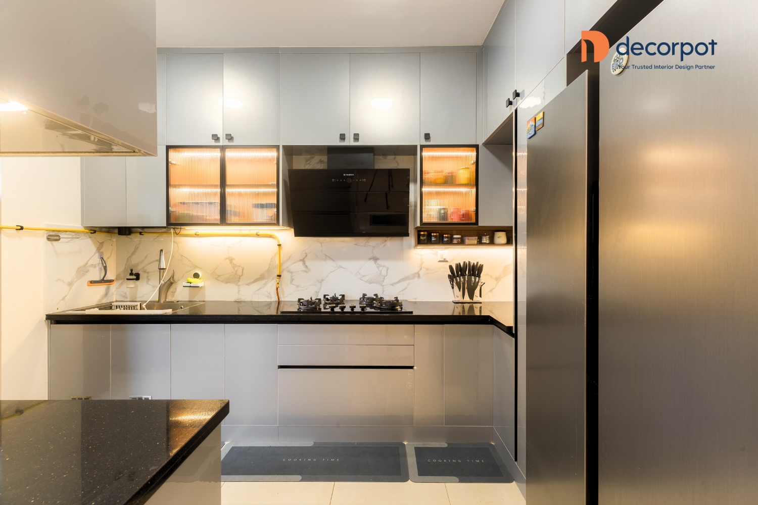 Interior designers in Bangalore at Decorpot brought this vision together through a seamless and well-guided process, where every design decision was shaped in close discussion with the homeowners. The result was a home with thoughtful details and well-balanced home interiors, from the crockery unit with a V-groove mirror backdrop and pooja space in the dining area to the modular kitchen with a granite countertop and storage options. In the bedroom, features like the wallpaper backdrop, tall storage unit with fluted glass near the dresser, and sliding wardrobe with lacquered glass shutter added both warmth and character. What stood out most for the homeowners was the honesty in pricing, the quality of finishes, and the way the entire home came together with clarity, comfort, and care.
