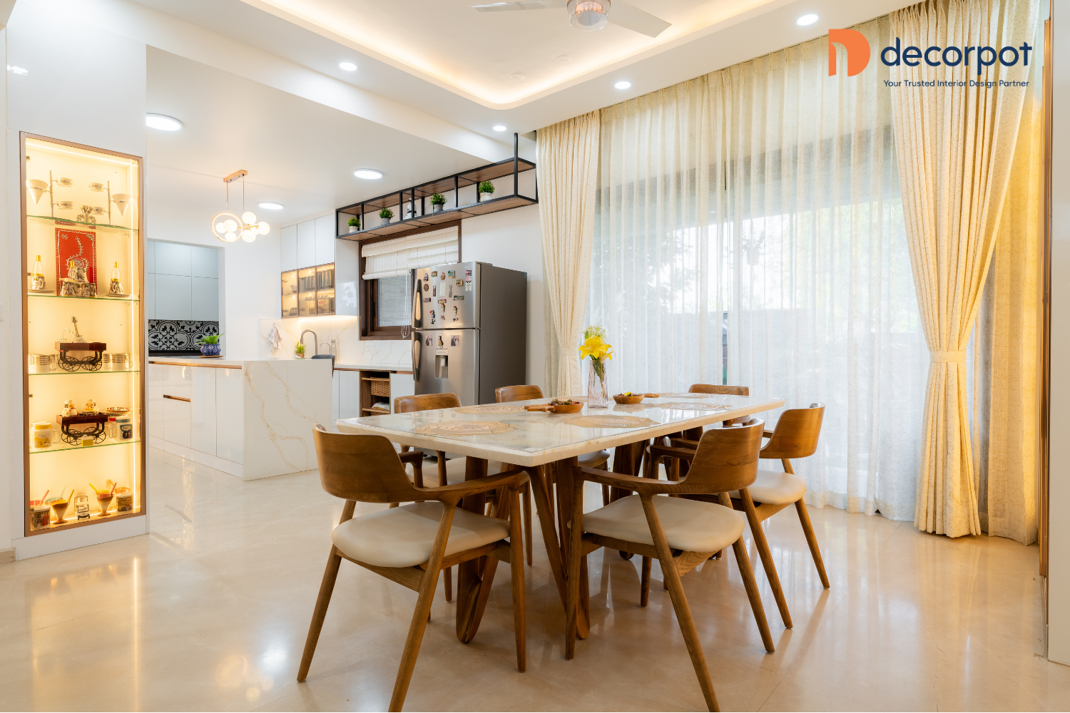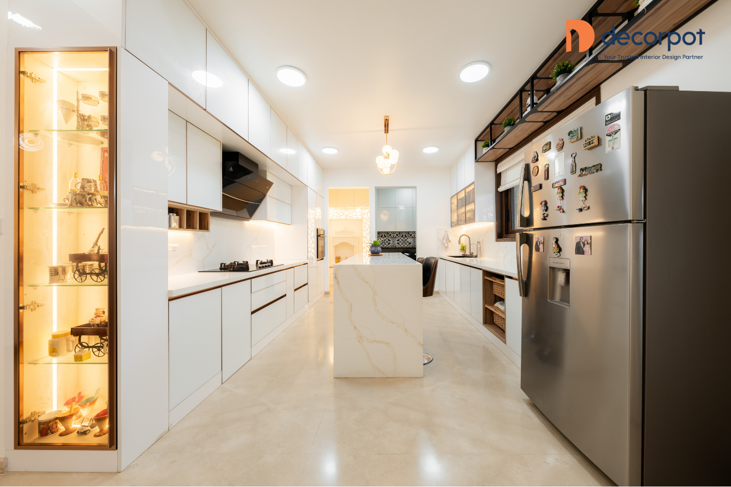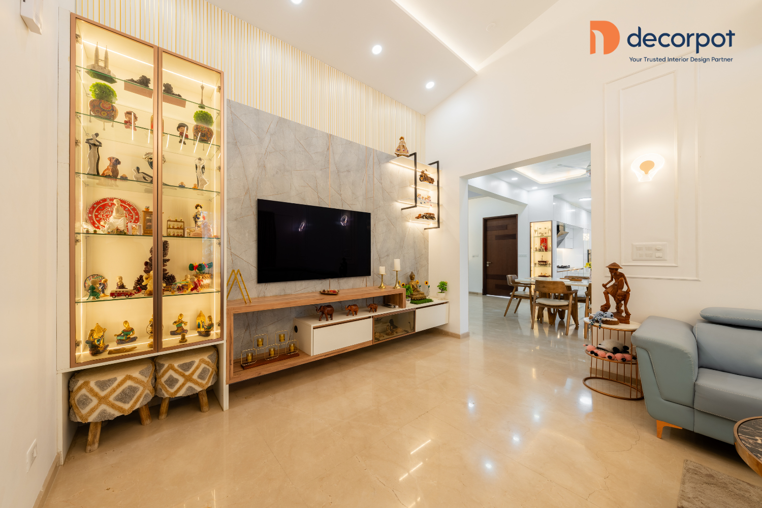 Decorpot translated these ideas into a home that felt bright, well-planned, and tailored to the family’s lifestyle. The living room design came together with a TV unit featuring a stone-finished back panel, a floating storage console, and a separate tall display unit that gave his artefact collection the space it deserved. The interior designers in Bangalore structured a white island modular kitchen with lofts and lacquered glass shutters, which became a standout feature of the home, combining visual lightness with everyday functionality.