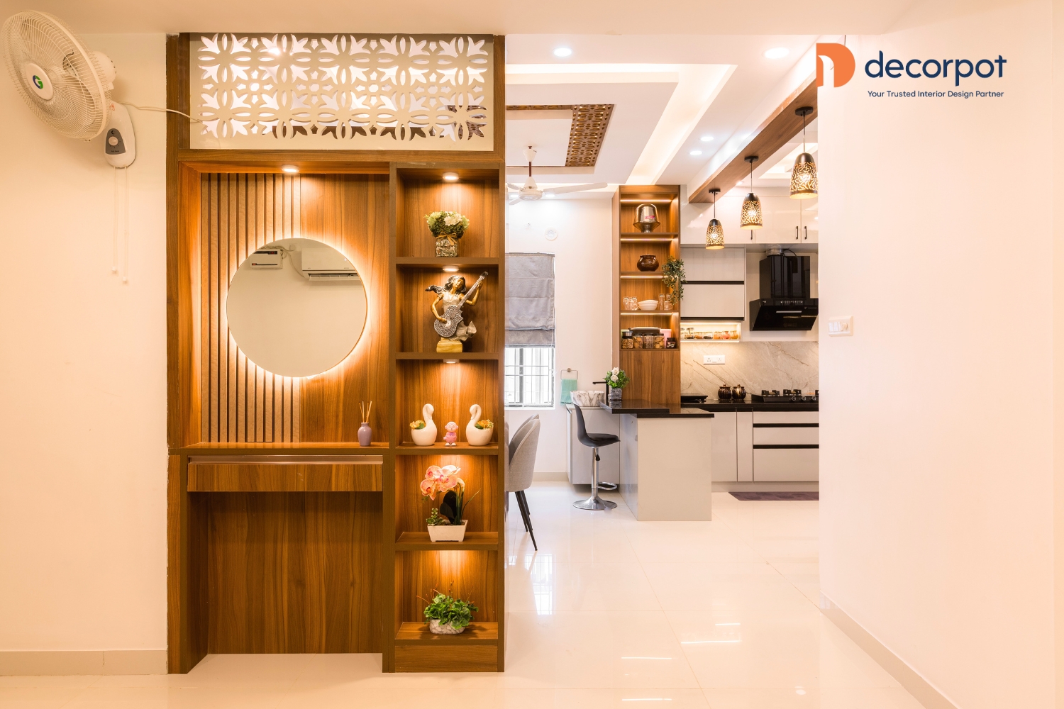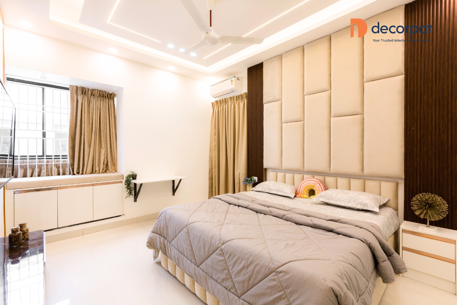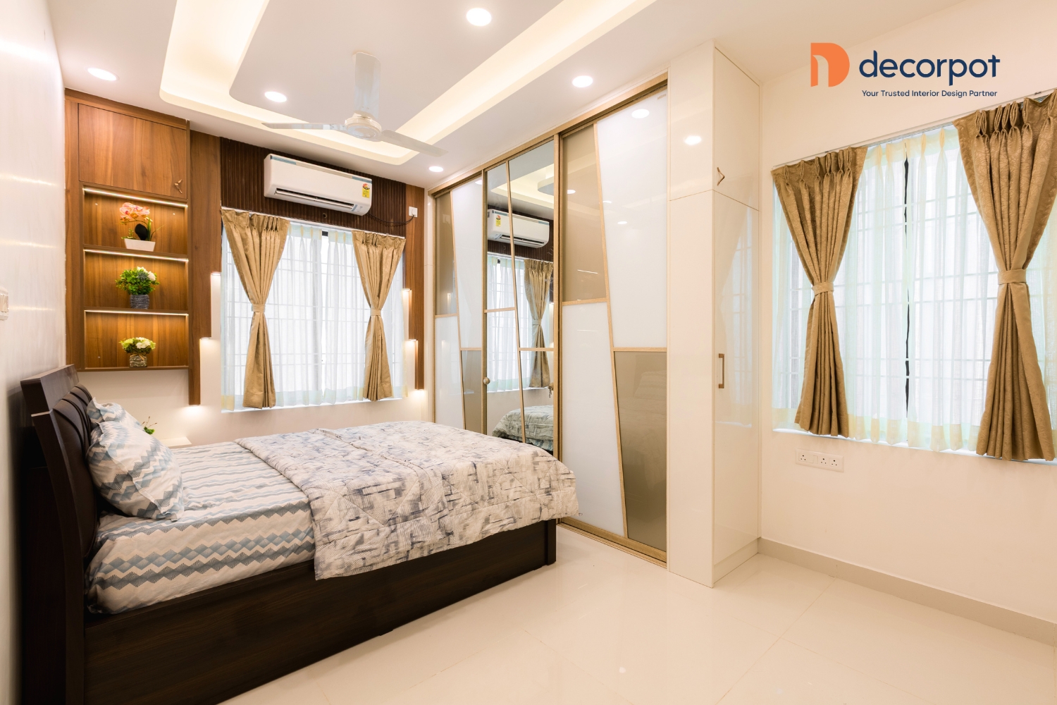 Decorpot brought this vision together through a balance of thoughtful design and practical planning. The TV unit with tinted glass added a refined focal point to the living room, while the modular kitchen with multiple storage options and a breakfast counter made daily use easy and efficient. Across the bedrooms, our interior designers in Chennai added features like floor-to-ceiling sliding wardrobes, a study table with storage, a sliding wardrobe with lacquered glass shutters, and a cozy reading nook, which helped each space feel tailored to the family’s lifestyle. With carefully planned home interiors in Chennai, the result was a 4BHK home that felt warm, organised, and easy to live in - reflecting Decorpot’s approach to end-to-end interior design with clarity, comfort, and thoughtful execution.
