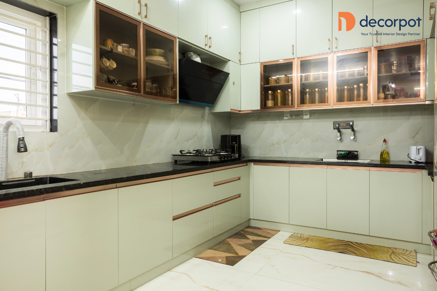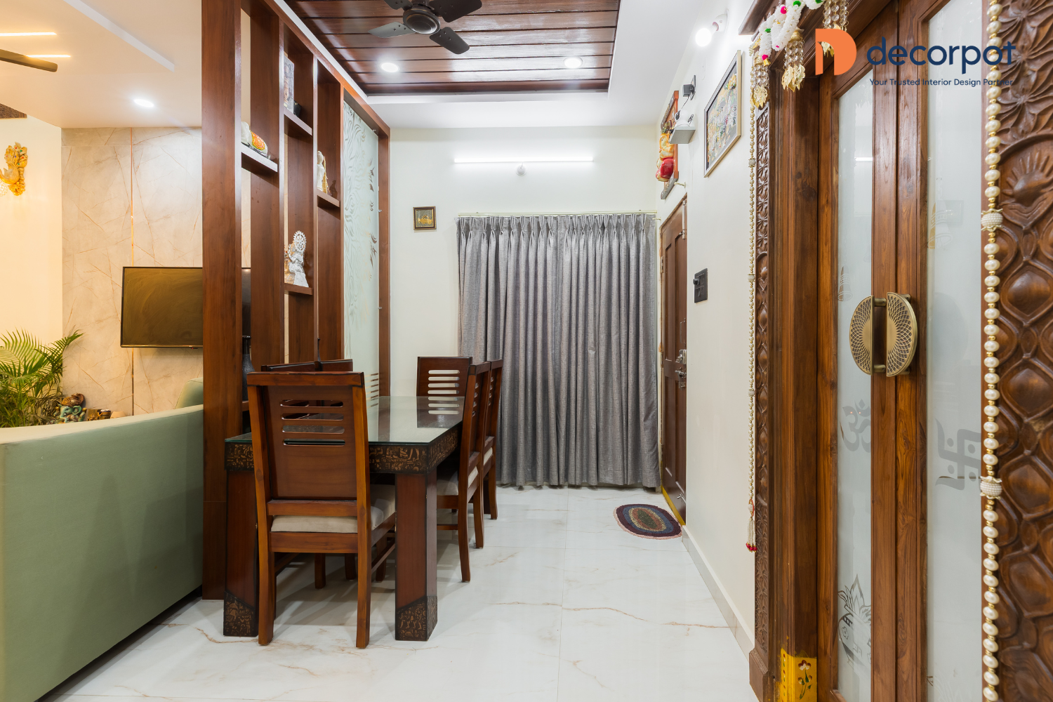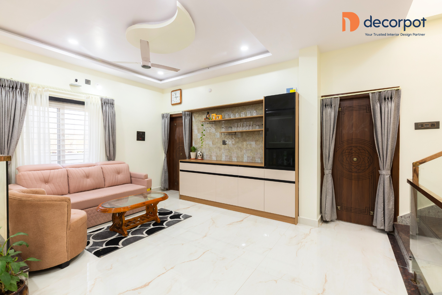Decorpot brought this vision to life with a careful mix of texture, lighting, and smart storage. In the living room, the TV unit, with a stone-finish back panel and rose gold detailing, created a strong focal point, while the louvered ceiling, room partitioner, and spot-and-strip lighting added depth and character to the space. The bar-cum-crockery unit with black-tinted glass and storage added both utility and a refined finish to the common area.