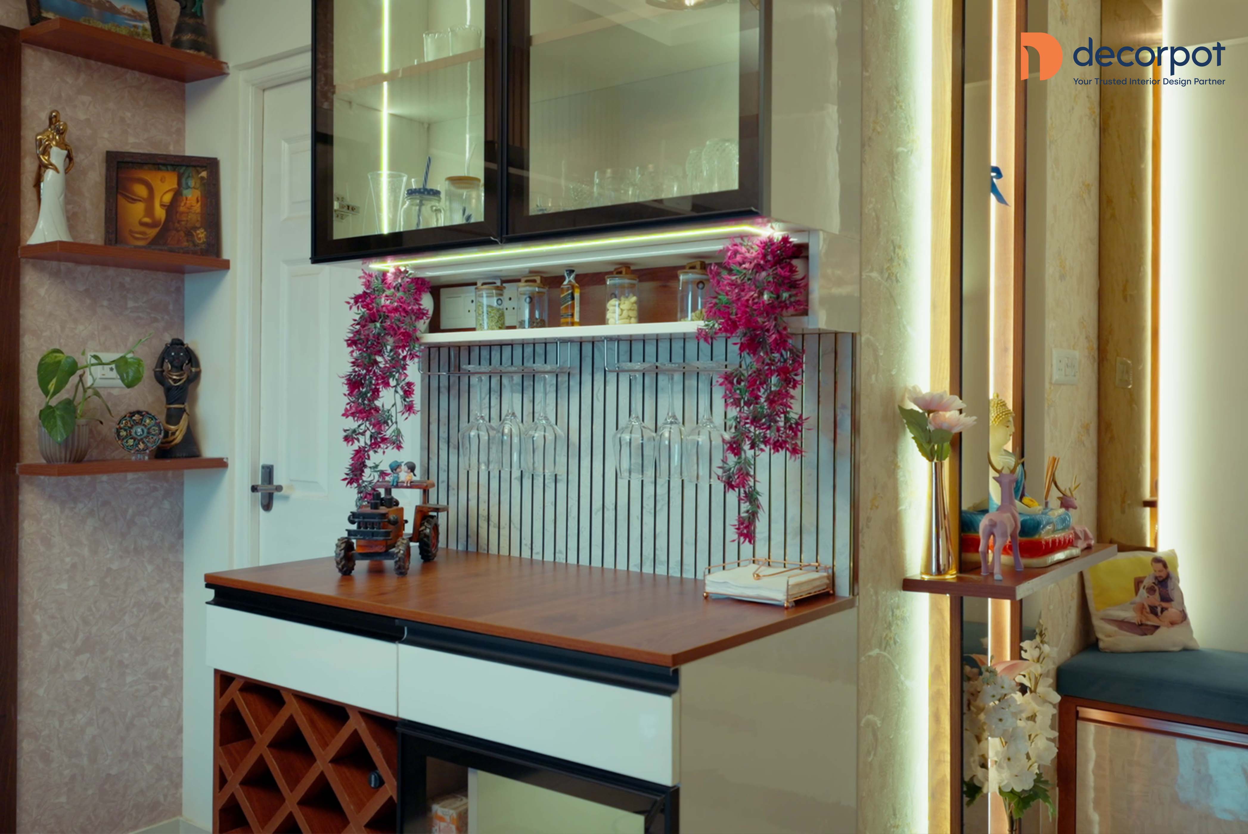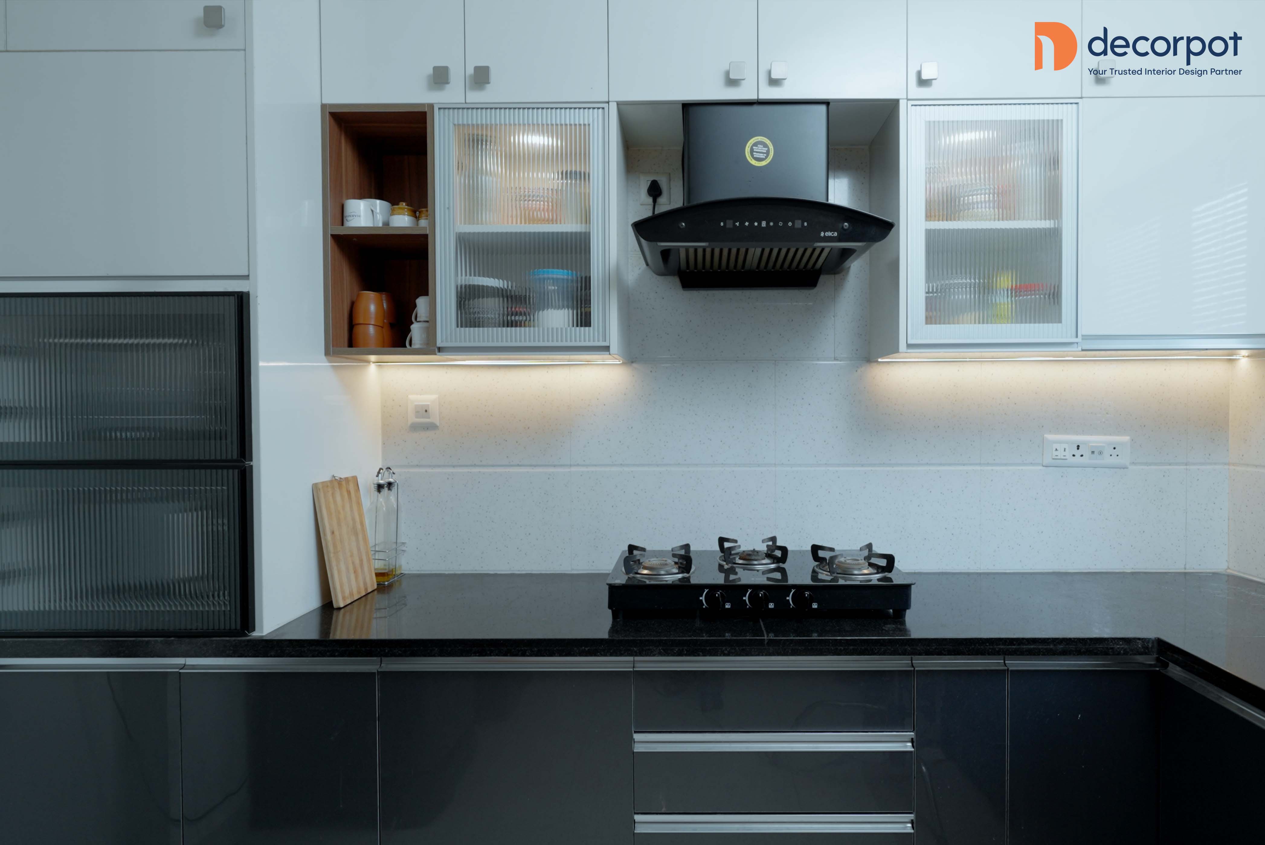We approached the home with a focus on simplicity, balance, and thoughtful detailing. As designed by our interior designers in Bangalore, the bedrooms feature overhead two-tone wardrobes for maximum storage utility. The L-shaped modular kitchen keeps the space efficient and well-organised for daily use.